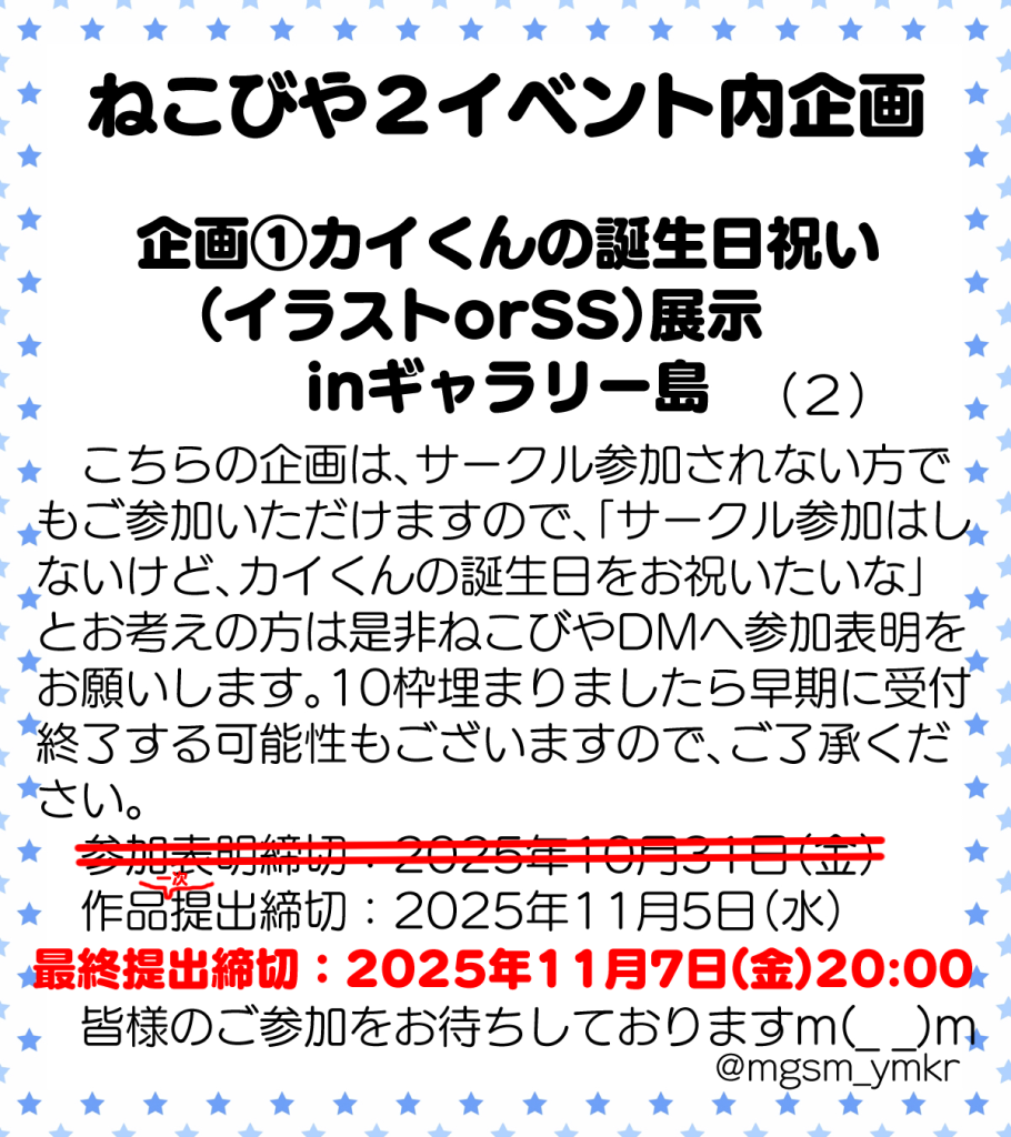 普段カイくんを描(書)かない方でも大歓迎です。お祝い展示に「協力してもいいよ」という方がいらっしゃいましたら、ねこびやXのDMまでご連絡ください。(参加表明締切:2025年10月31日まで) →参加状況を鑑み、参加表明不要にしました。最終提出締切は2025年11月7日(金)20:00です。ねこびやXアカウントのDMにて、直接作品を添付いただくか、ファイル転送サービスのURLをお伝えください。